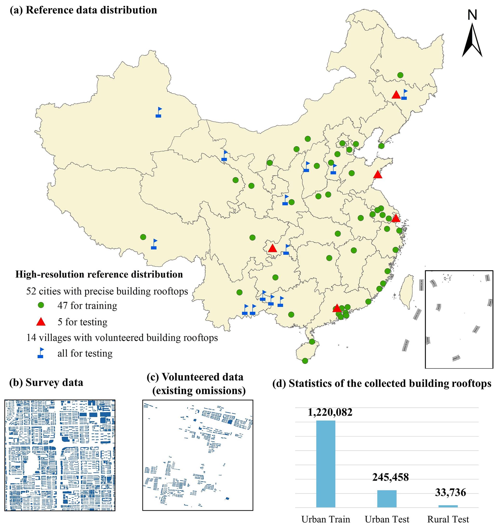 CBRA 以GeoTIFF(.tif)栅格文件格式组织,具有单个波段和GCS_WGS_1984坐标系。像素值为 0 和 255,其中 0 表示背景,255 表示建筑物屋顶区域。此外,为了方便数据的使用,CBRA 被分成 215 个空间网格图块,命名为“CBRA_year_E/W**N/S**.tif”,其中“year”是采样年份,“E/W**N/S**”是图块数据左上角的纬度和经度坐标。