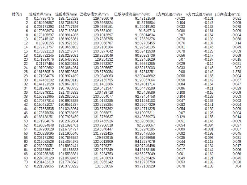 溃口形态数据是由结构光传感器采集的数据经程序处理计算所得,其中的溃口宽度和垂向深度均指溃口形态平均值;x、y、z方向的流速由多普勒流速仪直接采集所得;堤前、堤后、巴歇尔槽水位由浪高仪直接采集所得;巴歇尔槽流量通过此处水位数据计算所得,陡坎移动速率通过计算所得。