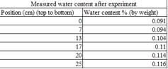 该数据集包括风积沙试样经过未冻水和土壤基质吸力的试验后,在不同深度位置处取样通过烘干法测得水分含量变化的数据。文件内数据为从实验装置的顶部开始,在0、7、13、17、20、25cm深度处重量含水量分别为0.091%、0.094%、0.104%、0.110%、0.114%和0.116%。