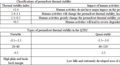 该数据集包含两类数据:冻土热稳定性分类标准和青藏工程走廊热稳定性冻土类型(以年平均地温划分)标准。第一类数据考虑了年平均地温、热稳定性指标、人类