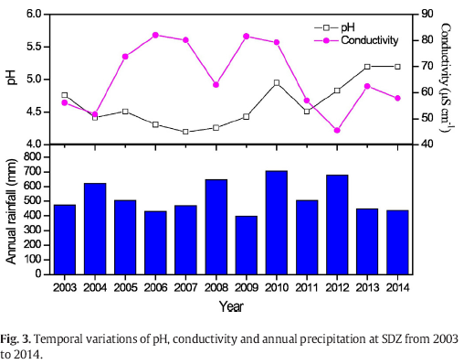 通过分析上甸子站长序列(2003-2014)年降水的化学成分,发现上甸子站年降水的平均pH值为4.53±0.35,这比其他本底站观测的pH值都要低,NH4+、SO42-、Ca2+和NO3- 是降水中的主要离子; NO3- 具有明显的增长趋势(7.26% year-1); SO42- /NO3- 在下降,说明上甸子的降水从硫酸型向硫酸-硝酸混合型转变。